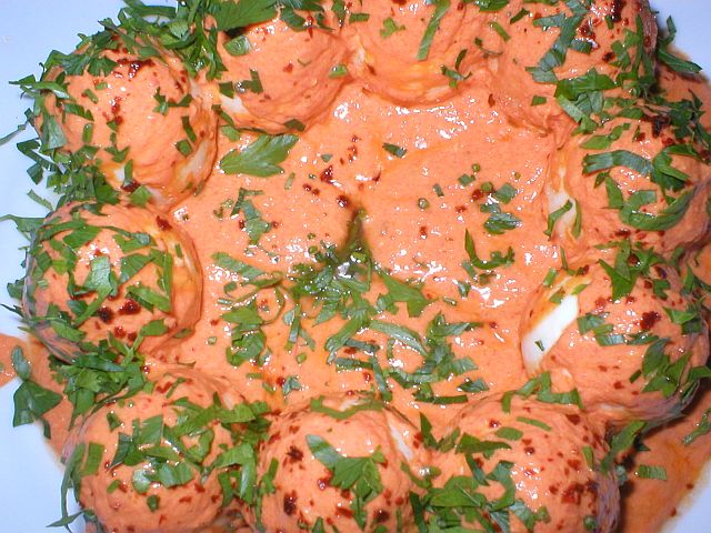 Eier in Knoblauchsauce mit Scharfer Paprikapaste