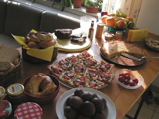 Croissants mit Butter, Tomaten-Champignon-Pastetchen, Zitronenkuchen